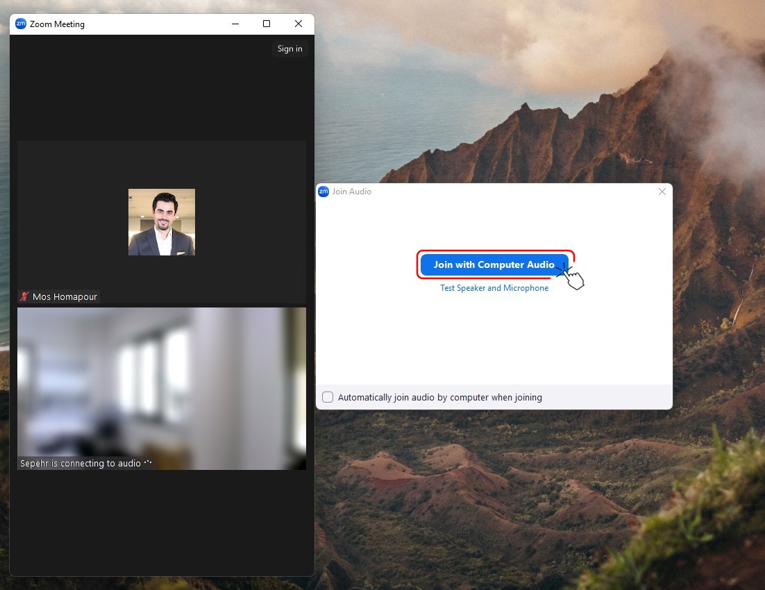 بعد از اجراشدن کلاس با نمایش این صفحه، گزینه Join with Computer Audio را انتخاب کنید.